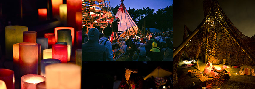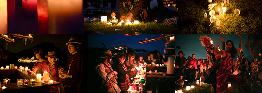 頂のメインイベント。夕暮れ時に会場内の電気を止めて、それぞれが持ち寄ったマイキャンドルに灯をともし、Tribal Stageのソーラー発電ライブを楽しむ特別な時間です。みんなが全員参加したらきっと素敵な事になるでしょう。会場一面に広がる無数のキャンドルの灯り、その中の一つ、その中の一人になって特別な瞬間を感じて下さい。その瞬間、全体で一つ。みんなで頂きましょう。