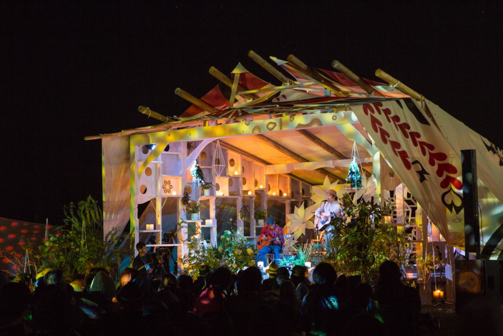 その後、静岡で頂チームが手掛ける様々なライブでPAを担当させて頂き、頂2010ではTrival stageに参加しました。まだキャンドルステージはティピだった頃で、「VarnaGhita /長沢哲夫」のライブでした。この時は、ライブに必要な電力の全てを太陽光発電の電力で行うチャレンジをしました。吉田公園に会場を移してから誕生したMoon stageは、一回目から担当しています。2011年からですから、今年は10年目です。