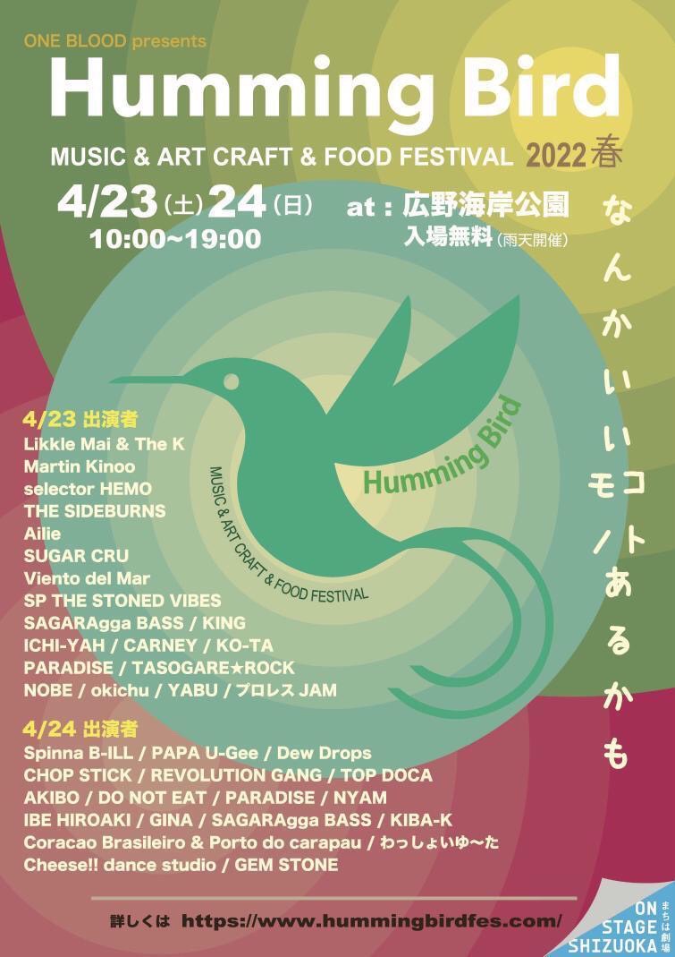 『Humming Bird 2022春』は、静岡市の用宗港そばにある駿河湾を望む絶賛なロケーションの広野海岸公園にて入場無料で開催される環境や食や物の大切さ、自由や平和、人との繋がりの大切さを、音、食、物を通じて伝える「なんかいいコト、なんかいいモノあるかも。」な野外フェス!